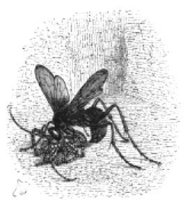 一天,在里奥的街坊,我被一场黄蜂和大蜘蛛的生死较量吸引住了。黄蜂是蛛蜂属(Pepsis),蜘蛛是狼蛛科(Lycosa)。大黄蜂刺向猎物,然后很快飞走。很明显,蜘蛛受伤了,试图逃走,它稍稍向下滚动,但仍然有力量地匍匐进了厚草丛中。大黄蜂又出现了,没有立刻找到猎物,它看起来感到很惊讶。然后,它就像猎狗追寻狐狸一样,开始搜寻。沿半弧圈飞行,始终快速振动翅膀和触角。蜘蛛,虽然躲了起来,但很快就被发现了。虽然对蜘蛛之钳口仍有余悸,可黄蜂仍对蜘蛛胸腔下部叮了两针。最后,黄蜂小心地观察了一下不动的蜘蛛触角,开始把它拖走。但我阻止了这样的“施害者”和“受害者”。