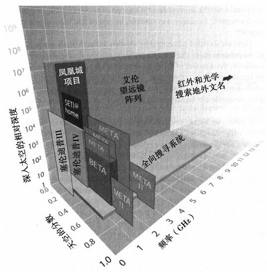 图6-3来自于《Sky&Telescope》杂志,通过测绘各种扫描尝试的能力和以三个主要参数为标准:到地球的距离、传输的频率、天空的比例说明了“搜寻地外文明”工程的范围63。