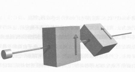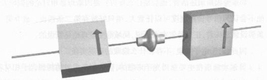 上面的实验还可以这样安排:考虑到一个装置辐射出不是向上自旋的粒子,就是向下自旋的粒子,我们可以在这些粒子飞行的途中放一个偏振片,例如,只有向上自旋的粒子才能通过。在这个偏振片后再放上第二个偏振片,这个偏振片选择自旋的方向与前一个自旋方向的夹角可以任意,例如90°,则通过第二个偏振片的电子只有一半,如下页图7-2所示。