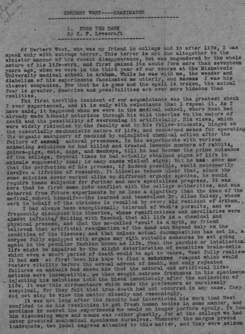 《赫伯特·韦斯特——尸体复生者》的打字稿。