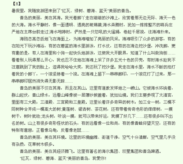 暑假里,我随旅游团来到了“红瓦、绿树、碧海、蓝天”美丽的青岛。