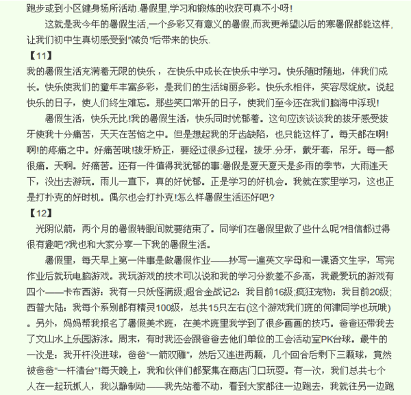 这样就是我今年的暑假生活,一个多彩又有意义的暑假,而我更希望之后的寒暑假都是可以能这样子,让我们初中生真切体验到"减负"后带来的快乐.