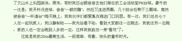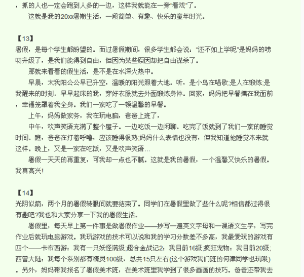 暑假里,每天早上第一件事是做暑假做业——抄写一遍英文字母和一课语文生字,写完做业后就玩电脑游戏。我玩游戏的技术可以说和我的学习分数相差不大高,我最爱玩的游戏有四个——卡布西游:我有一只妖怪满级;超合金战记2:我现在16级;疯狂宠物:我现在20级;西普大陆:我每个系别基本都有精灵100级,总共 15只上下(这一游戏我们班的何津同学也玩哦)。除此之外,妈妈帮我报名了暑假美术班,在美术班里我学到了非常多画画的技巧。爸爸还带我去了文山水上乐园游泳。周末,有时我还可以跟爸爸去他们单位的工会活动室PK台球。最牛的一次是:我开杆没进球,爸爸“一箭双雕”,然后才又连进两颗,几个回合后剩下三颗球,竟然被爸爸“一杆清台”!每天晚上,我和伙伴们基本都聚集在商店门口玩耍。有一次,我们总共七个人在一块玩抓人,我以静制动——我先站着不动,看到小伙伴们基本都往一边跑去,我就往另外一边跑,抓的人也必需会跑到人多的一边,这样子我就能在一旁“看戏”了。