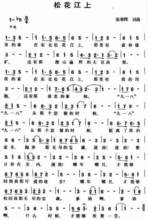 《松花江上》是一首脍炙人口的男高音抒情歌曲,由张寒晖作于1936年。