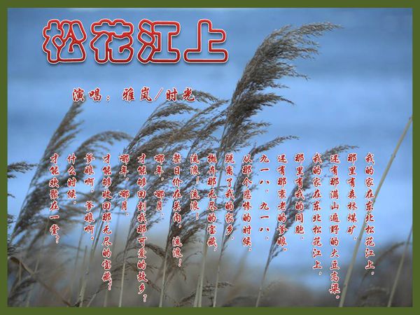 “我的家在东北松花江上,那里有森林煤矿。还有那满山遍野的大豆高粱……”这是上个世纪三四十年代曾被誉为“流亡三部曲”之一,而风靡中华大地的抗战歌曲《松花江上》。