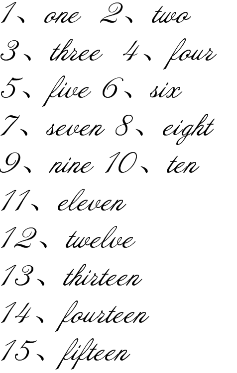 11、eleven 12、twelve 13、thirteen 14、fourteen 15、fifteen