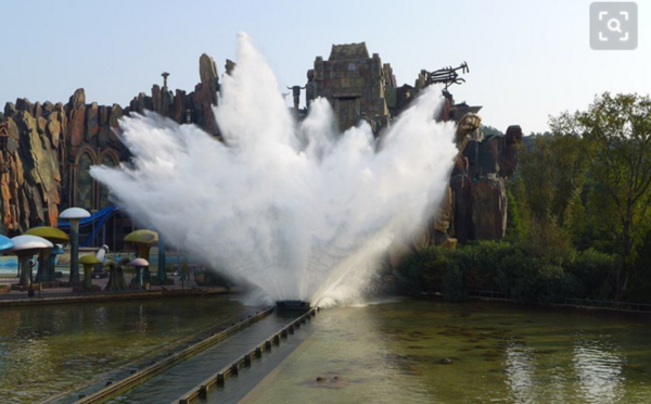 一下车,映入我们眼帘的是美丽的喷泉包围着一个金色的大圆球,上面有着3个醒目的大字“嬉戏谷”。