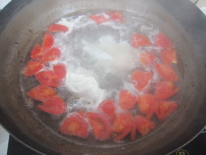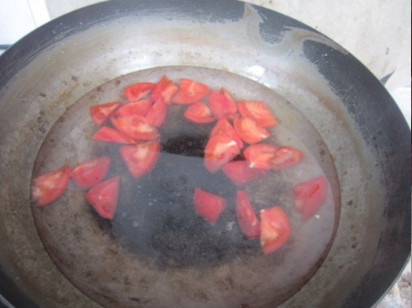 2、锅中做水,放入西红柿块,盖盖大火烧开;