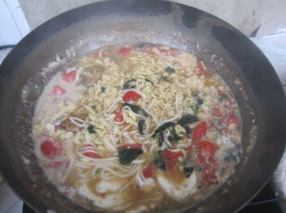又煮了一会儿,锅盖上面冒处一层层白气,我又打开盖子,“呀!这次面条真熟了。