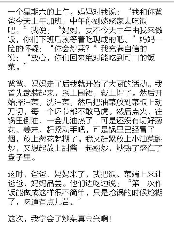 读《第一次动手炒菜》有感从二年级的情况下开始,老师就经常叫我们多读课外书,如各种作文和四大名著。